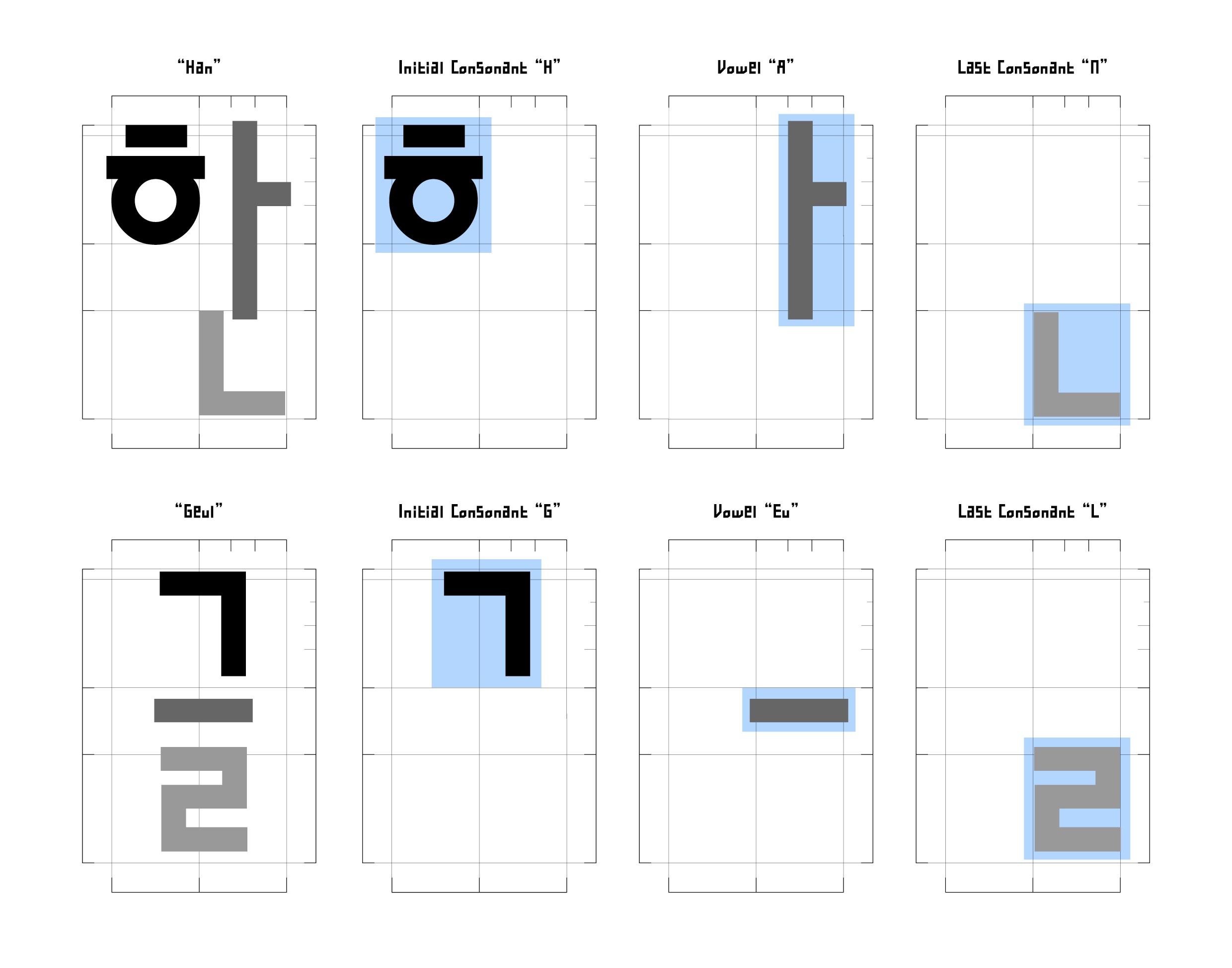 한글은 음운 변화를 표현하기 위해 한글의 구성 요소가 결합하는 형식입니다. 이는 오랜 세월에 걸쳐 자연스럽게 발전한 전통적인 문자 체계와는 차별화됩니다. 그리고 1985년 안상수에 의해 한글꼴이 완전히 재해석되면서, 기하학적 형태를 실험할 수 있는 급진적인 가능성이 열렸습니다.