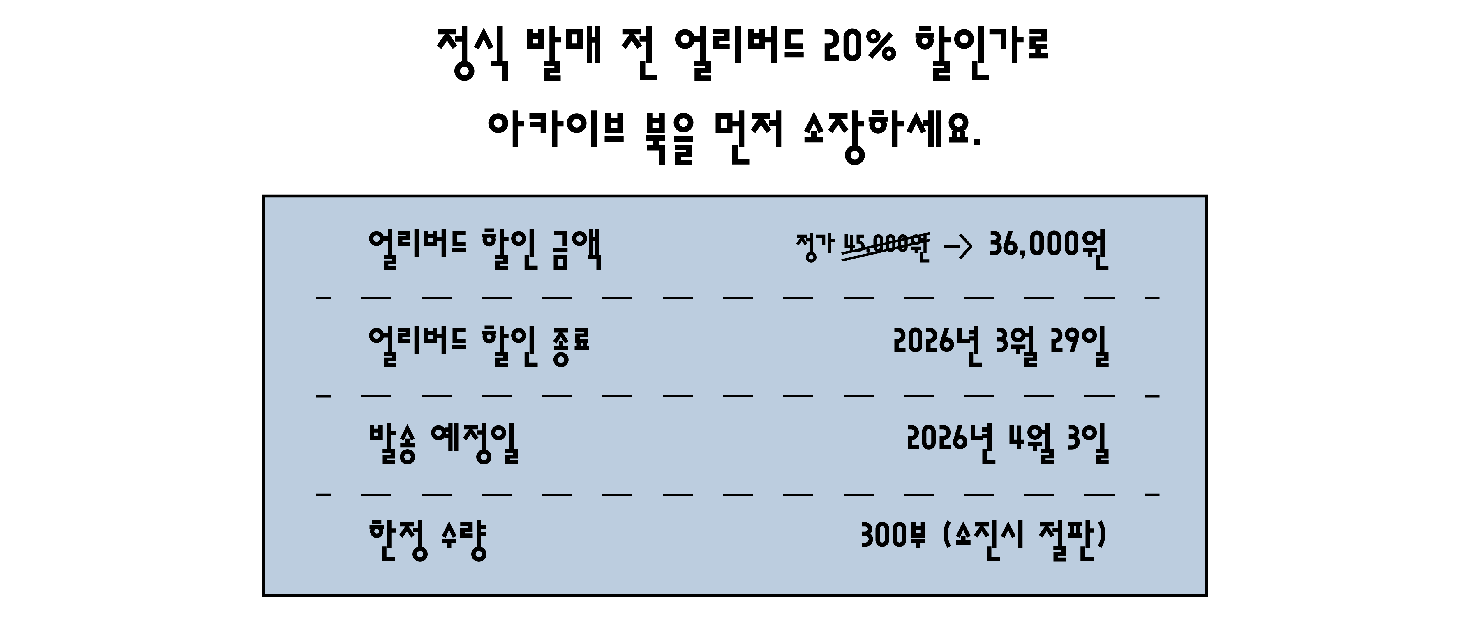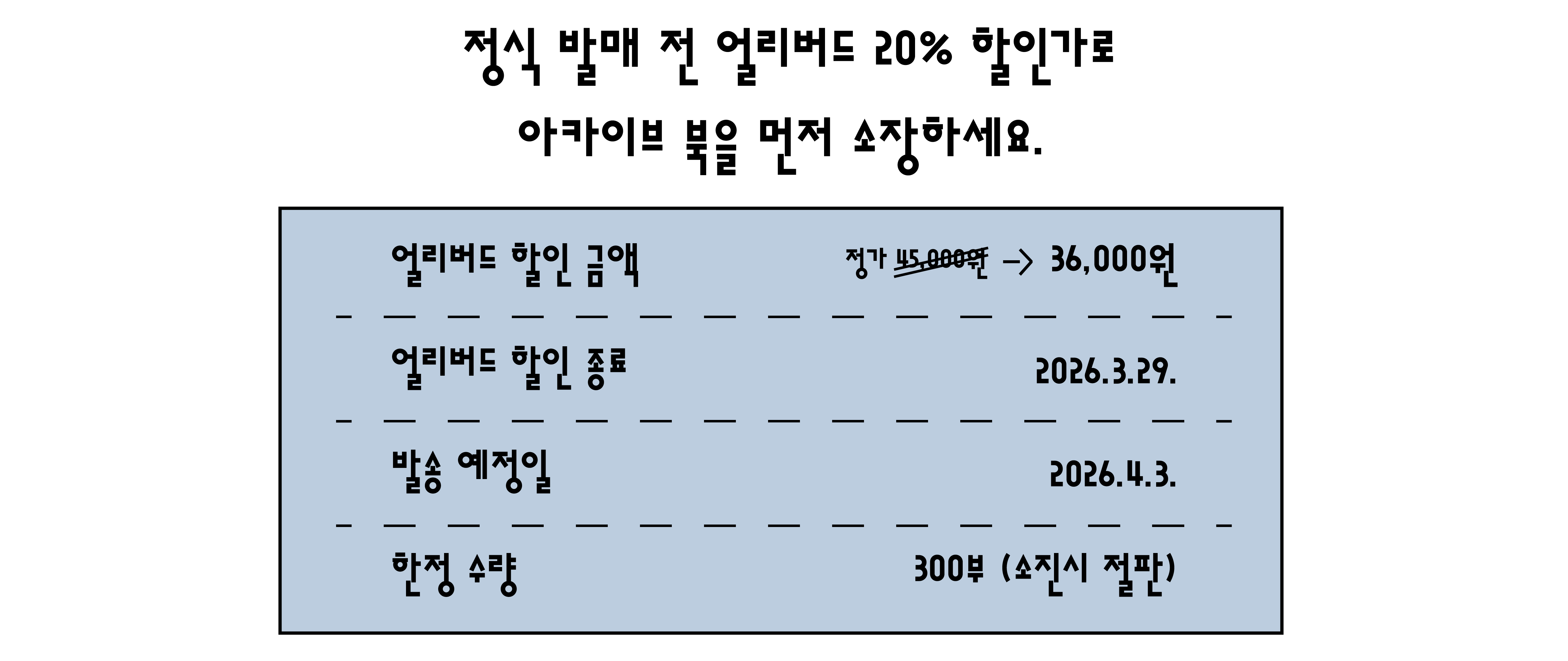 대량 생산되는 상품이 아닌, 300부 한정으로 제작되었습니다. 얼리버드 혜택 안내 지금이 지나면 이 가격으로 구매할 수 없습니다. 사전 예약 기간이 종료되면 잔여 수량은 즉시 정가(45,000원)로 인상되어 판매되며, 300부 소진 시 재쇄 없이 절판됩니다.